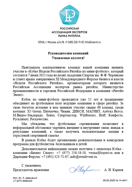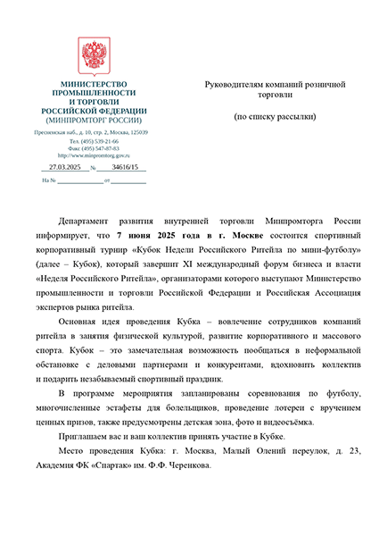 Приглашаем вашу компанию принять участие в традиционном спортивном празднике среди организаций российской розницы — «Кубок Недели Российского Ритейла`26» по мини-футболу, который состоится 7 июня на полях Академии «Спартак» по адресу: г. Москва, Малый Олений переулок, дом 23.